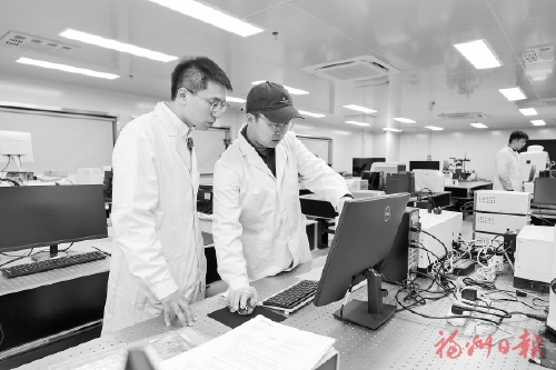 魏游超(左)和同事探讨实验数据银泰融通。福州日报记者 包华摄