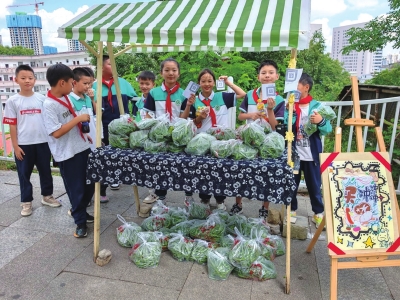 采摘结束后,师生共同开启“辣椒变变变”实践环节:新鲜的青辣椒被孩子们精心挑选、整理,在校园门口搭建起临时“爱心小摊”。从设计标签到主动向师生介绍青辣椒的新鲜品质,孩子们在与人沟通、处理交易的过程中,不仅锻炼了语言表达与社交能力,更懂得了劳动成果的价值。