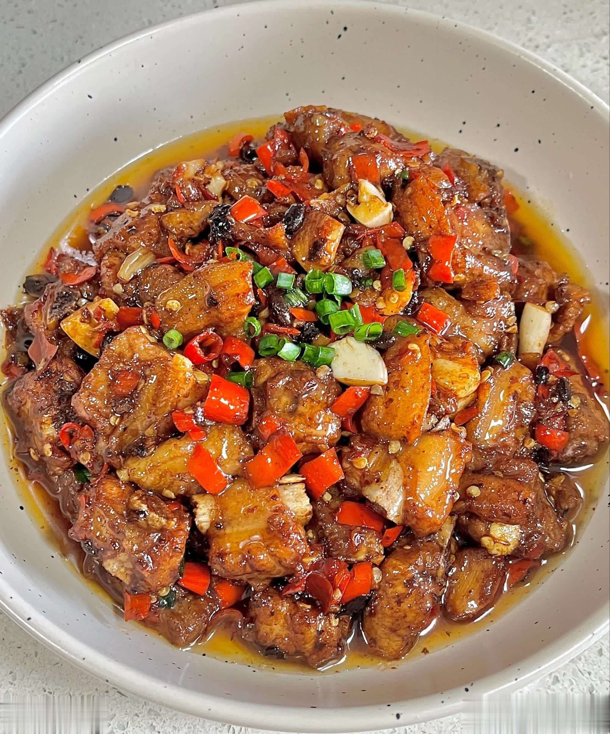 4. 大火收汁到浓稠,撒点辣椒圈更诱人。五花肉的油脂渗进排骨里,香到舔手指!