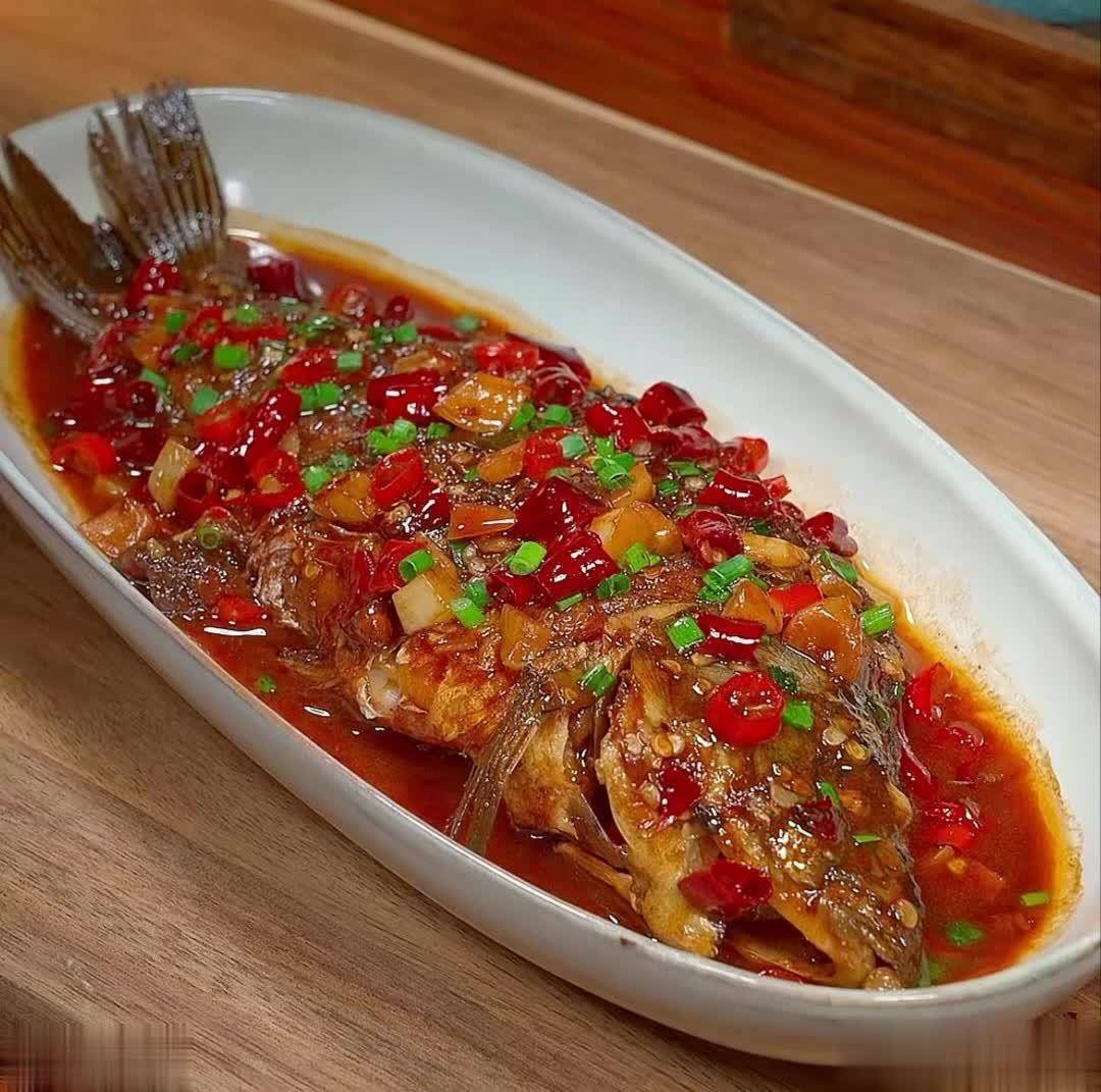 6. 等汤汁剩三分之一时,开中火,不停把汤汁浇在鱼身上,鱼皮完整,味道也更浓。