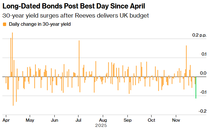 30年期英国国债因对经济前景的反应更为敏感,因此在周三引领了债券市场的上涨。其收益率下降了 12 个基点,这是自 4 月以来(也是贸易关税冲突最严重的时期)的最大单日跌幅。