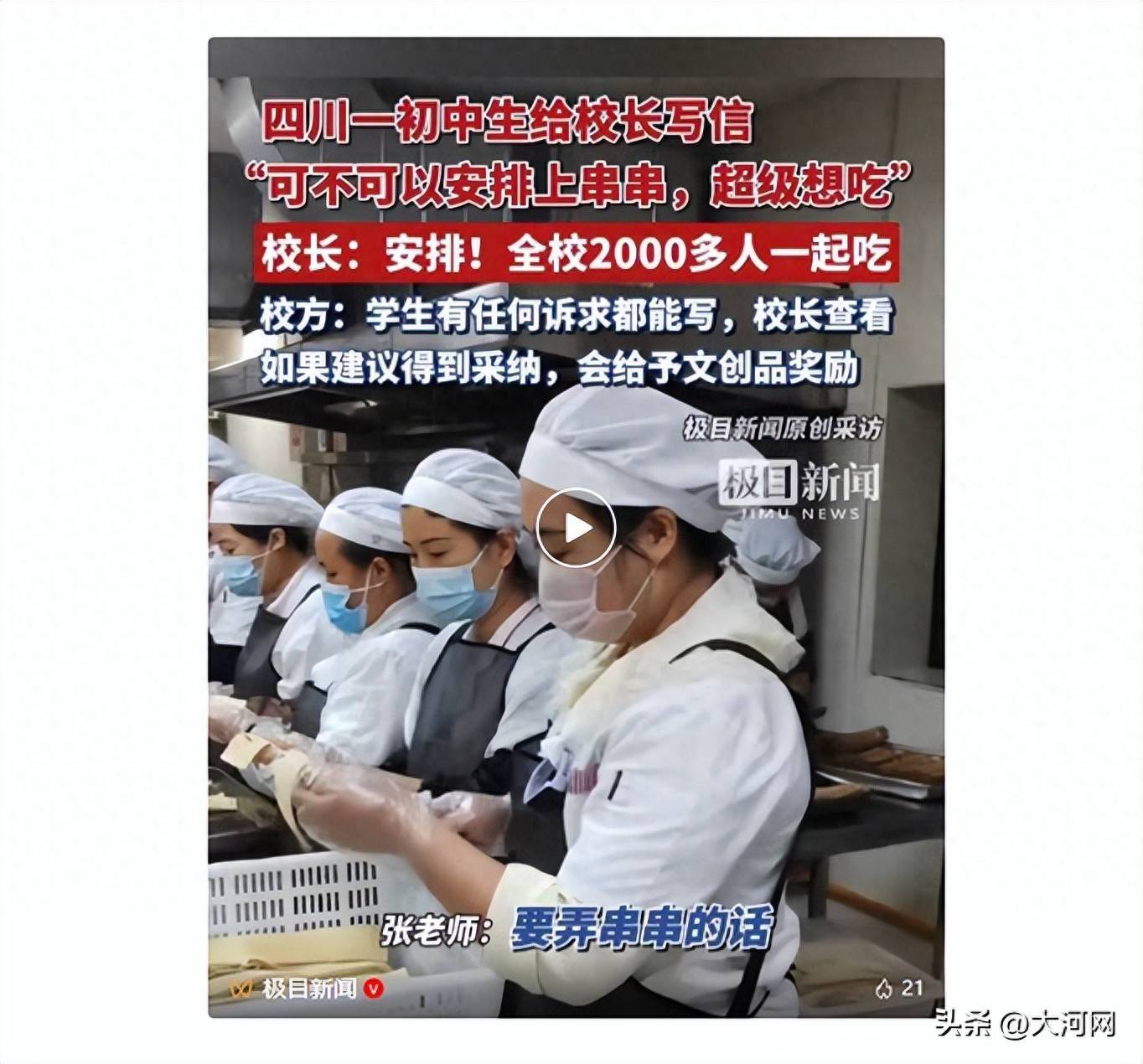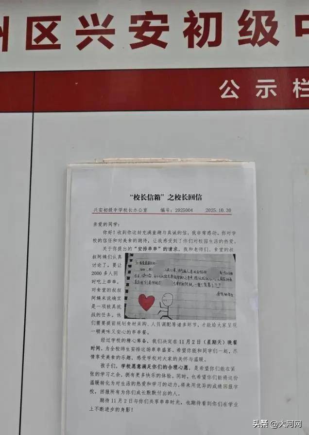 兴安中学校长办公室回复该学生,校长同学校老师、食堂工作人员商讨,要让学校2000多人一同吃上串串是一项极具挑战性的任务,需要提前规划食材采购、人员调配等,经过学校精心筹备,决定于11月2日晚餐,为全校师生安排串串盛宴。“孩子们,学校愿意满足你们的合理心愿,希望你们能在紧张学习之余,拥有更多快乐体验。”